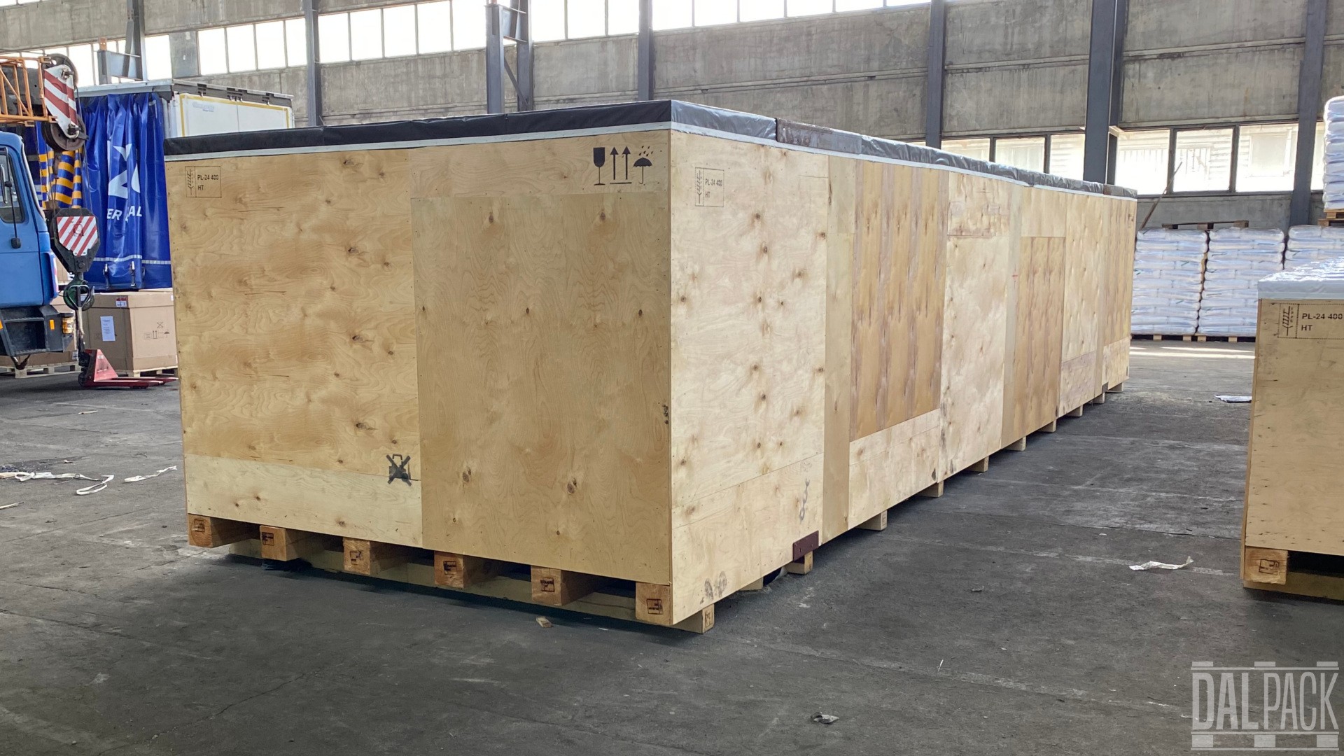 Wewnątrz opakowania zabezpieczyliśmy na czas transportu morskiego maszynę o masie własnej około 15T.