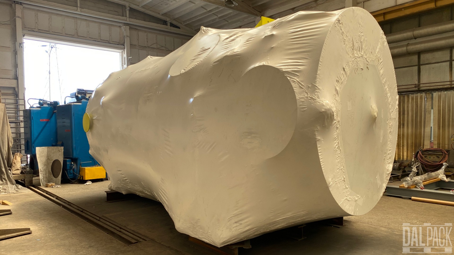 Zdjęcie przedstawia zbiornik ciśnieniowy spakowany w folię termokurczliwą VCI, która zapewnia skuteczne zabezpieczenie przed korozją.