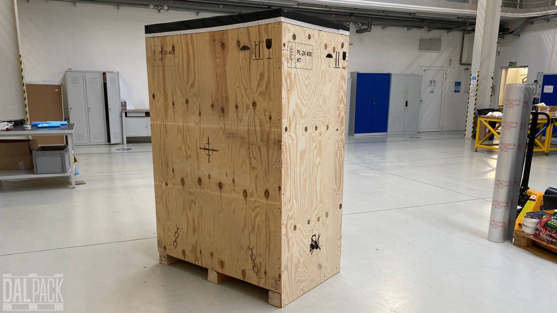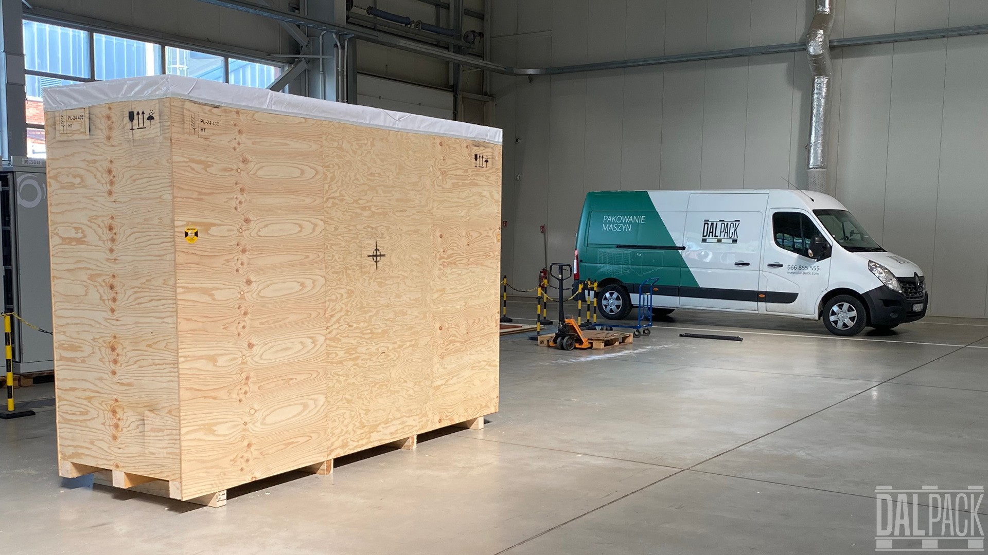 Zdjęcie przedstawia wykonaną przez nas skrzynię ażurową oraz urządzenie, które spakowaliśmy do transportu drogowego.