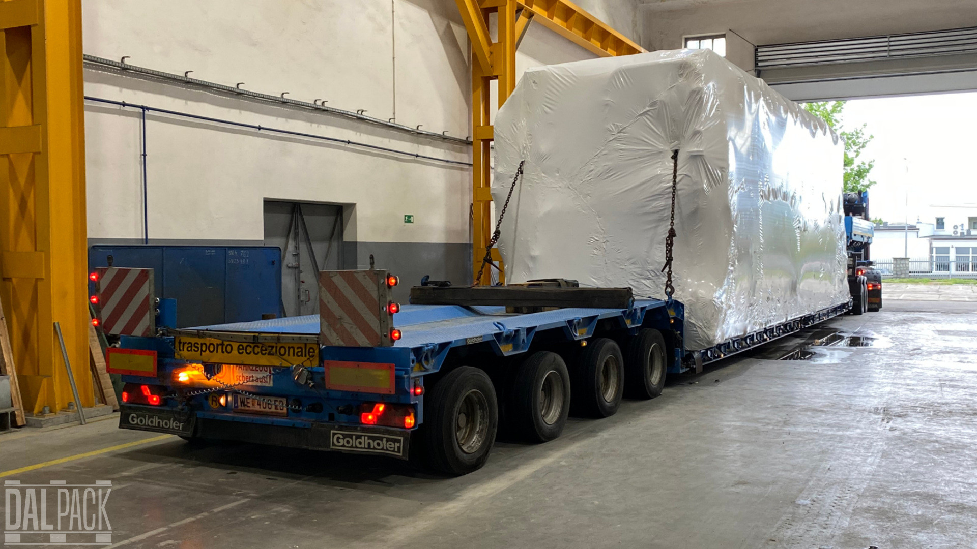 Zabezpieczyliśmy maszynę na czas transportu drogowego folią termokurczliwą oraz plandeką wodoodporną, którą wykonaliśmy na wymiar.