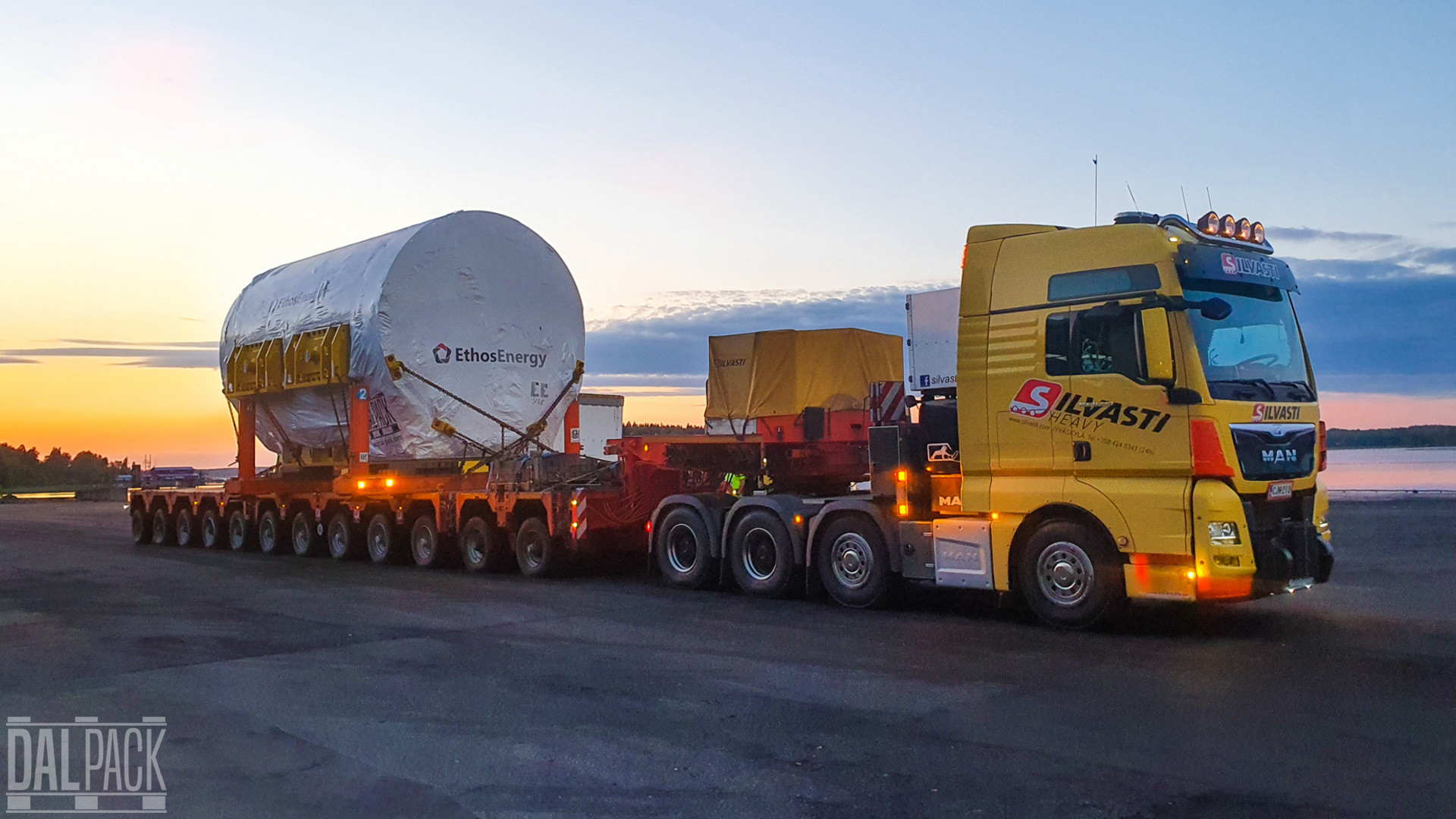 Powyższe zdjęcie przedstawia zachód słońca w Finlandii oraz generator w czasie transportu do elektrowni jądrowej.