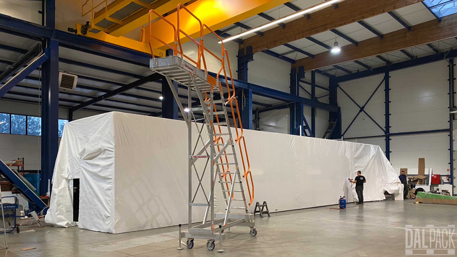 Na powyższym zdjęciu przedstawiamy urządzenie w trakcie pakowania o wymiarach zewnętrznych 18500 x 3280 x 3400 mm i masie własnej 31T.