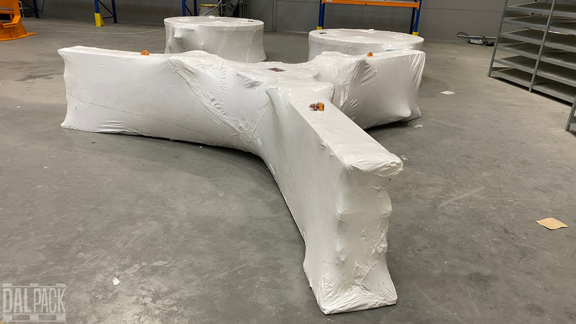 Na powyższym zdjęciu widnieje spakowany przez nas trawers w kształcie litery "Y" oraz dwie mniejsze konstrukcje. Wszystkie detale zabezpieczone zostały metodą Shrink Wrap.