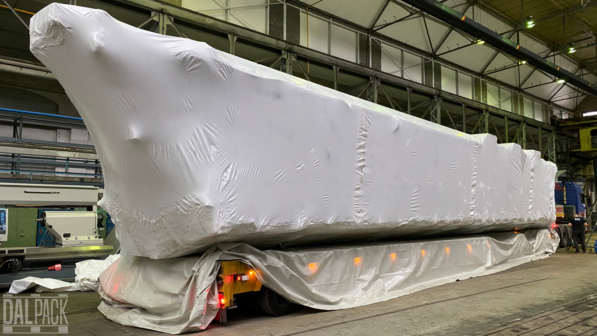 Powyższe zdjęcie przedstawia maszynę spakowaną do transportu lądowego w folię termokurczliwą oraz plandekę. Dodatkowo zastosowane zostały pochłaniacze wilgoci.