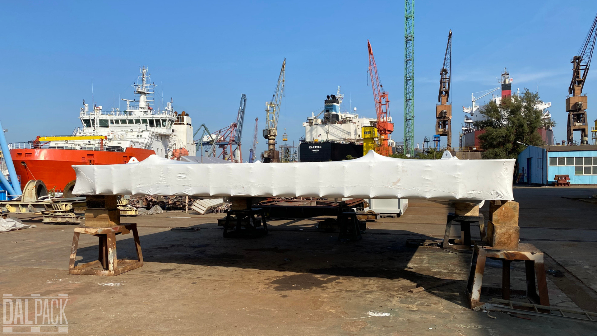 Powyższe zdjęcie przedstawia spakowaną przez nas konstrukcję okrętową o wymiarach: 8950 x 6367 x 884 mm.