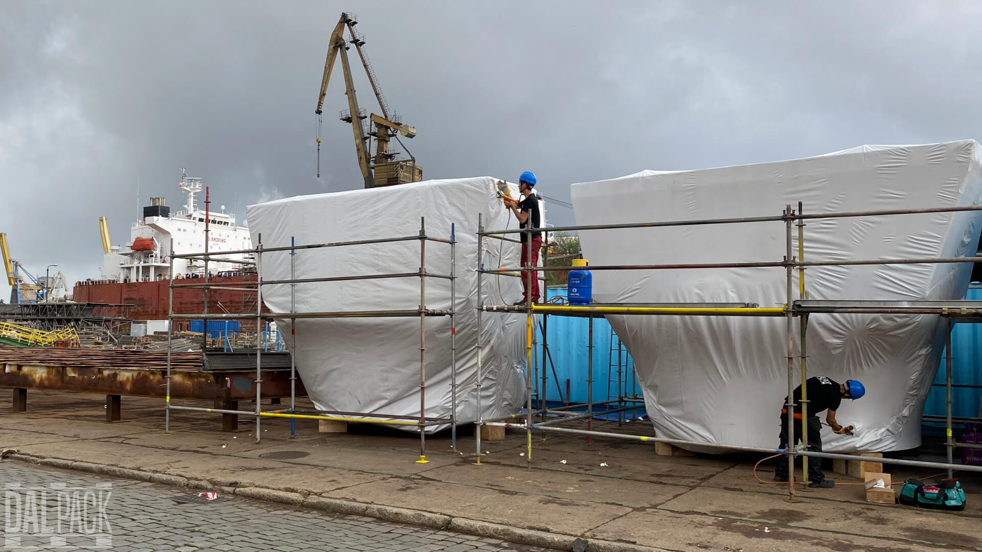 Pakujemy na czas transportu morskiego, lotniczego oraz drogowego dowolne konstrukcje, pojedyncze maszyny, elementy maszyn, a także całe linie produkcyjne. Wykonujemy drewniane opakowania eksportowe dla przesyłek przemysłowych (podesty, palety, podbudowy, skrzynie ze sklejki, skrzynie z OSB oraz skrzynie z pełnego drewna). Zabezpieczamy ładunki ponadgabarytowe folią termokurczliwą. Mocujemy towary w kontenerach morskich.