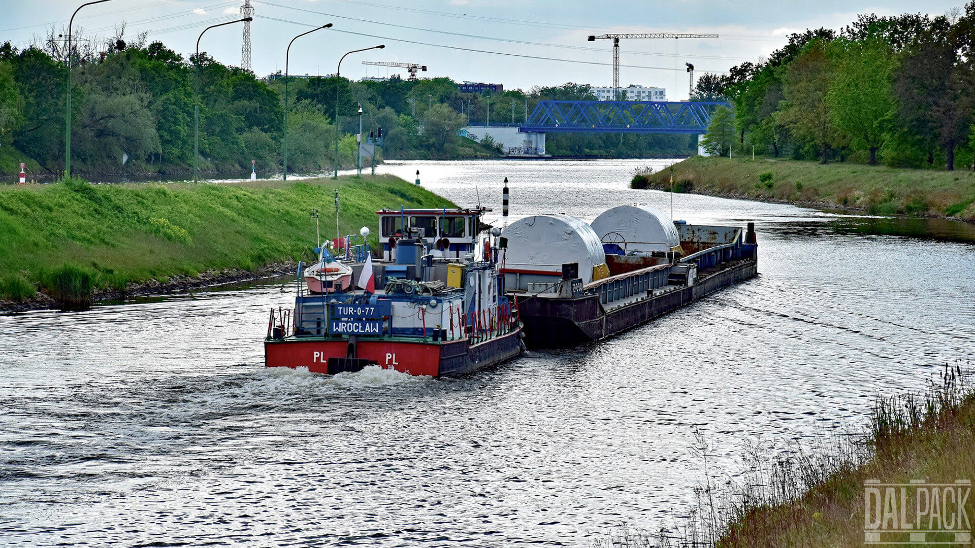Na powyższym zdjęciu przedstawiamy spakowane przez nas generatory wyprodukowane dla elektrowni atomowej. Zestaw generatorów z uchwytami transportowymi ważył 384 000 kg. Ładunki zostały przetransportowane drogą śródlądową do portu w Szczecinie, skąd wyruszyły w dalszą podróż.