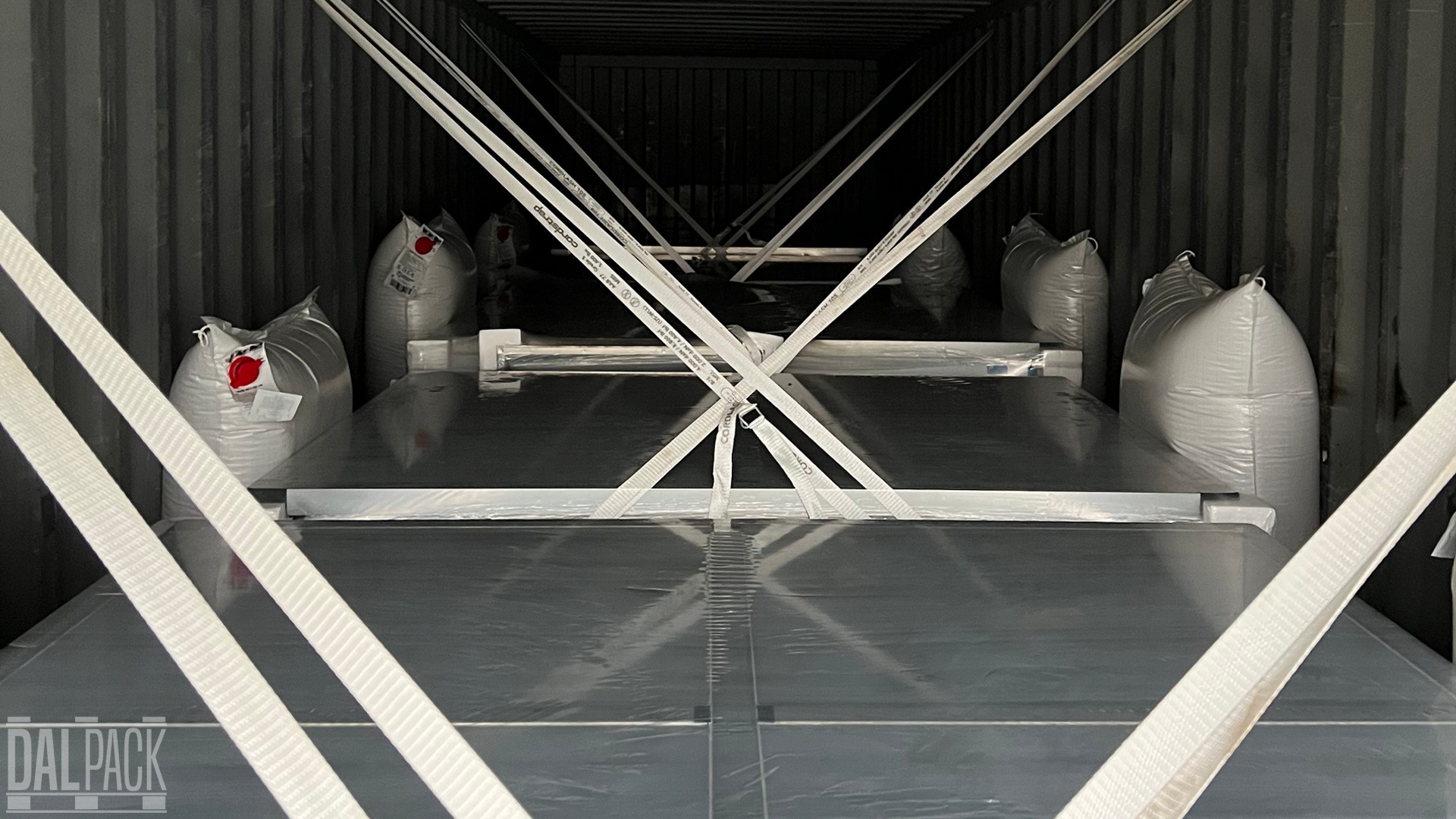 Zdjęcie przedstawia ładunki unieruchomione workami sztauerskimi oraz pasami.